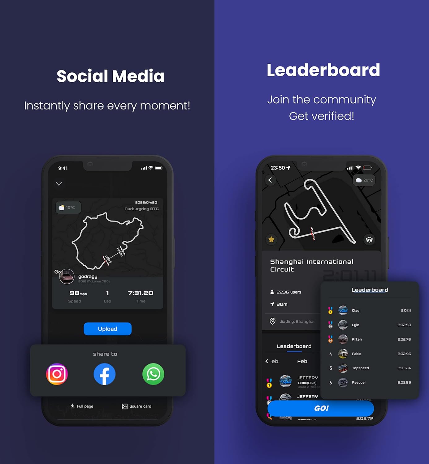 Join a community of car enthusiasts, see how you stack up with others, share your times, and upload videos with live speed overlays.